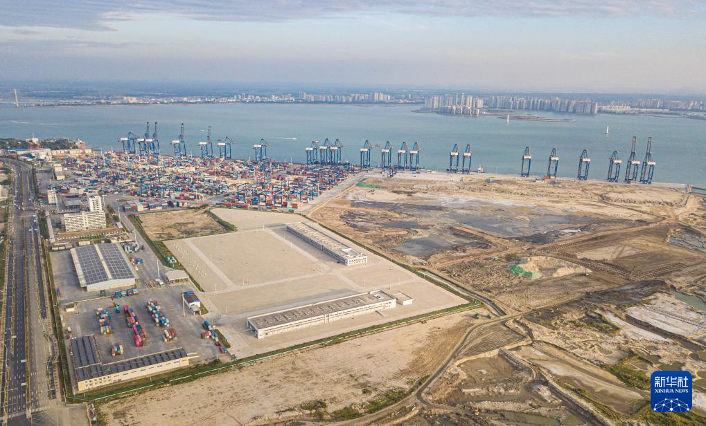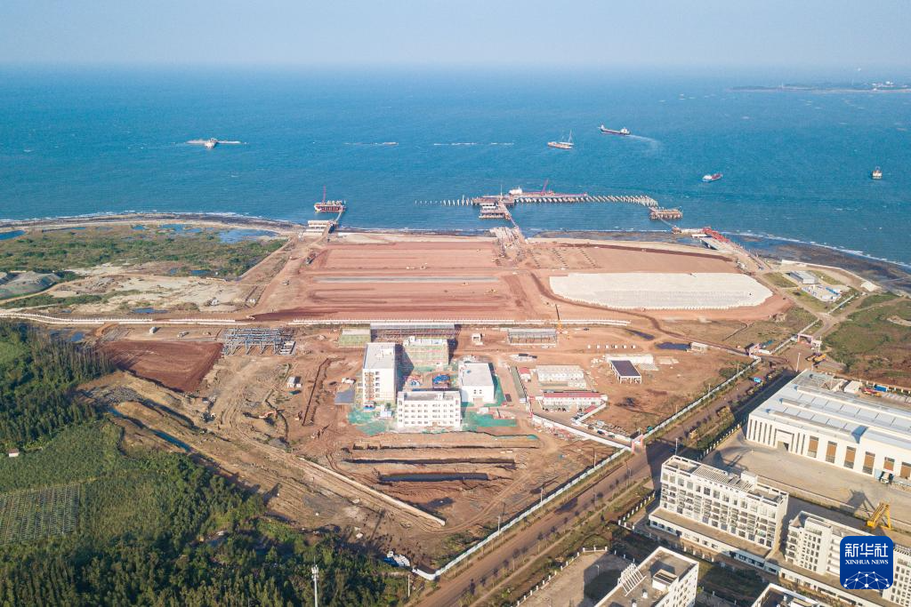 在海南自贸港重点园区——洋浦经济开发区拍摄的洋浦港封关运作项目和配套工程,远处是建设、发展中的洋浦国际集装箱码头(无人机照片,11月21日摄)。新华社记者 蒲晓旭 摄