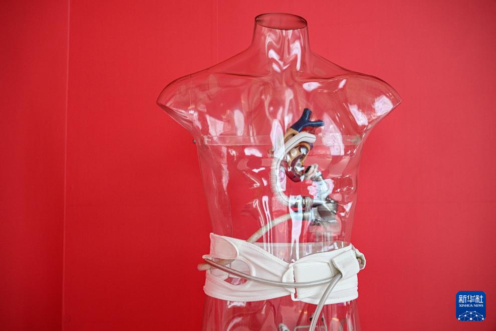 在海南自贸港重点园区——博鳌乐城国际医疗旅游先行区举办的“永不落幕”国际创新药械展上拍摄的植入式左心室辅助系统,该系统俗称“人工心脏”(10月27日摄)。新华社记者 蒲晓旭 摄