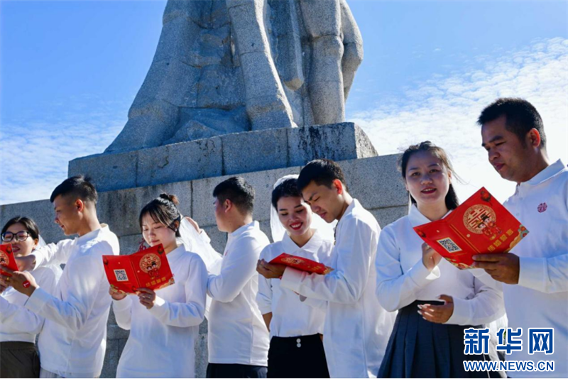 三亚市鹿回头婚姻登记处为领证新人举办集体婚礼。新华网发