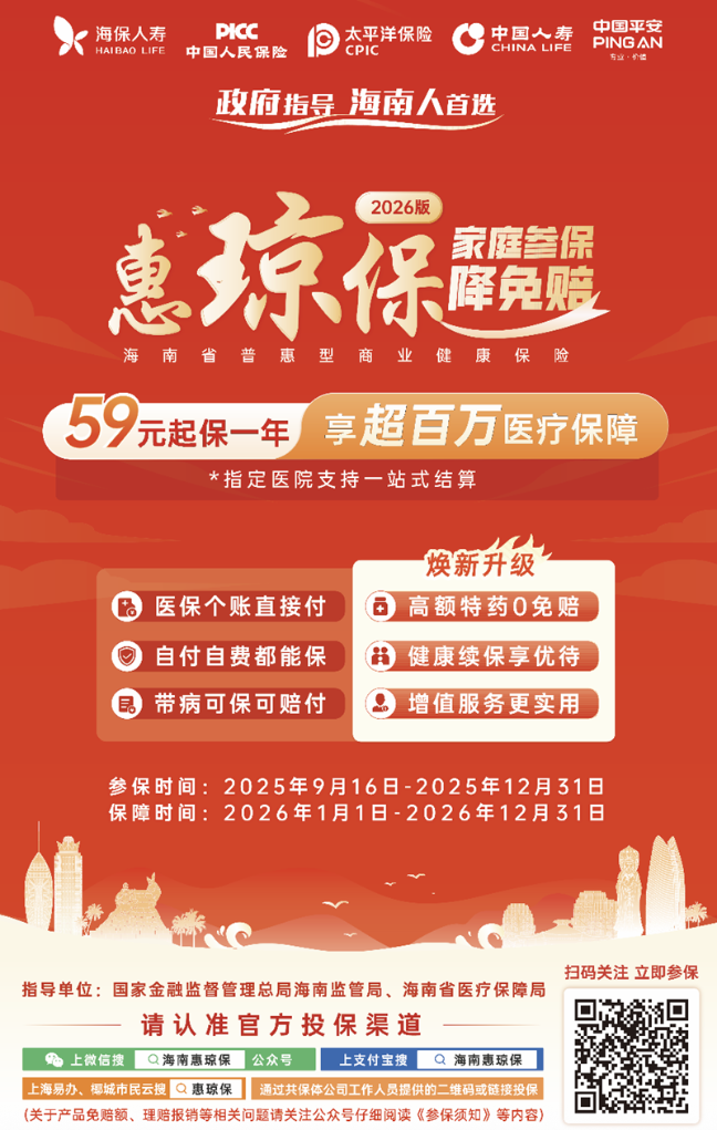 “惠琼保”2026版由国家金融监督管理总局海南监管局和海南省医疗保障局指导推出,是海南多层次医疗保障体系的重要组成部分。参保“惠琼保”2026版B款和B款升级版的参保人,在使用这9种创新药时,只要符合理赔条件,即可享受0免赔额、最高100万元的报销额度。