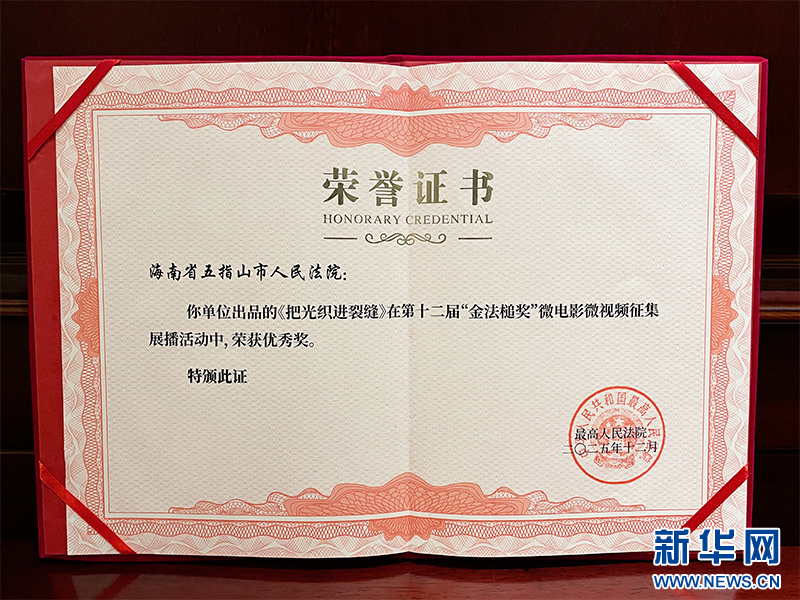 12月17日上午,第十二届“金法槌奖”微电影微视频暨2024年度全国法院“十佳百优”新媒体账号作品颁奖式举行。五指山市人民法院报送的作品《把光织进裂缝》荣获“金法槌奖”微视频组优秀奖。