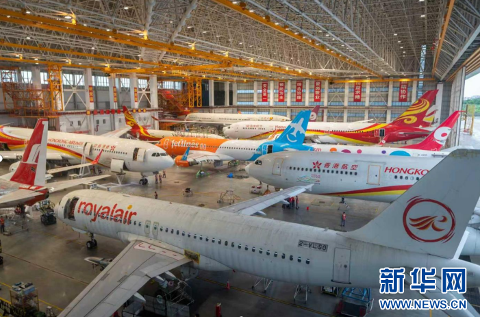 繁忙的一站式飞机维修产业基地定检机库。新华网发