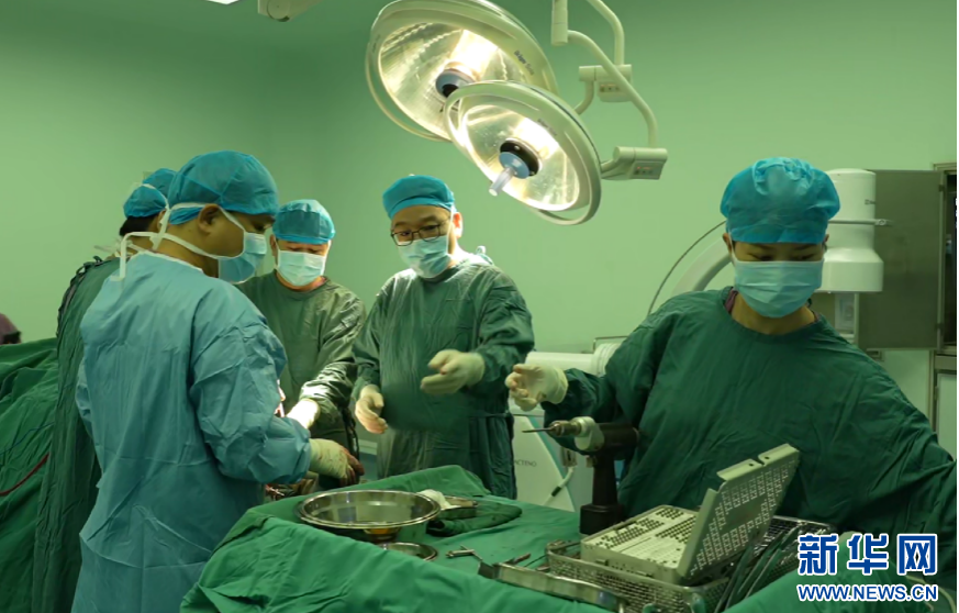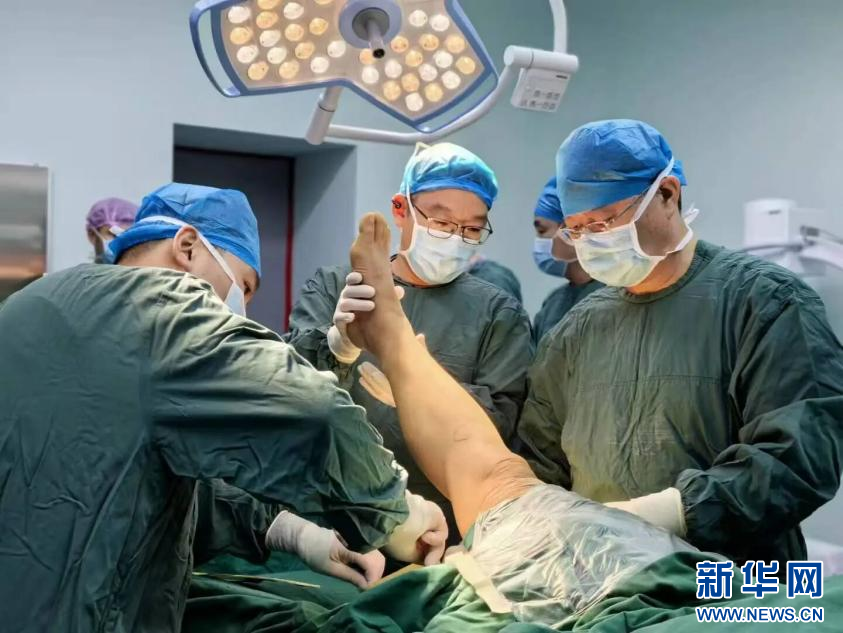 华西医院张晖(右一)与王建华(右二)团队进行全踝关节置换手术现场。新华网发