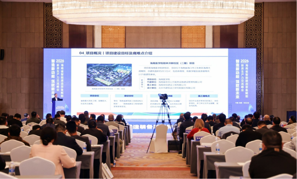 1月22日,“2026年海南省智能建造装备赋能新质生产力交流峰会”在海口成功举办。海南控股旗下海控城市综合运营集团所属海南发控建设工程有限公司(以下简称“海控建设”),作为海南省国有建设企业代表受邀出席,并在峰会上作题为《智造未来,协同共进:海南医科大学桂林洋新校区(二期)智能建造应用汇报》的典型案例分享,全面展现企业在智能建造领域的创新实践与成果。