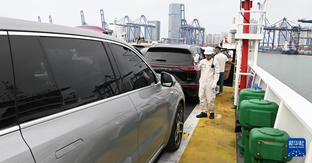 1月30日,在海南省海口市秀英港,工作人员指挥新能源汽车在“绿源二号”上有序停放。新华社记者 杨冠宇 摄