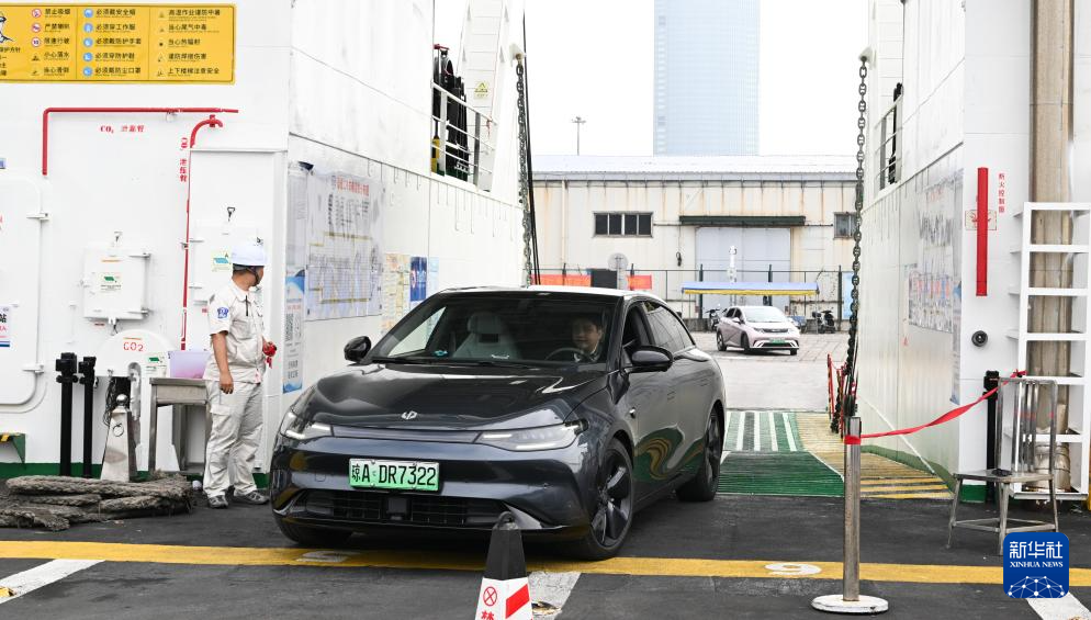 1月30日,在海南省海口市秀英港,新能源汽车驶入“绿源二号”。新华社记者 杨冠宇 摄