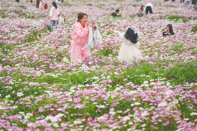 1月30日,位于海口美兰区琼山大道的海南国际花卉产业园,大片格桑花迎冬绽放。色彩缤纷的格桑花海,吸引众多市民游客前来打卡拍照。海南日报全媒体记者 李天平 摄