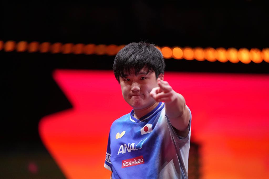 2025年12月14日,日本选手张本智和在香港进行的世界乒乓球职业大联盟总决赛男单决赛中。