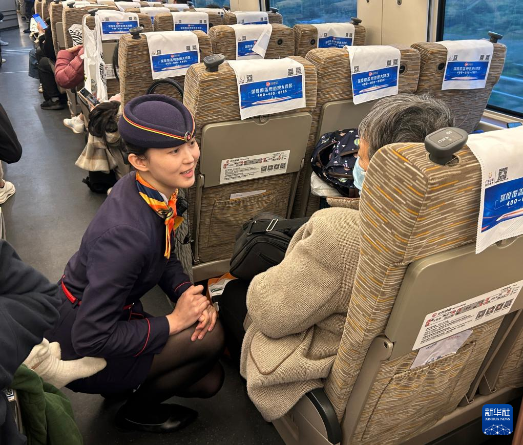 2月7日,G5131次列车列车长任丹丹在车厢内问候老人。新华社发(李格格 摄)