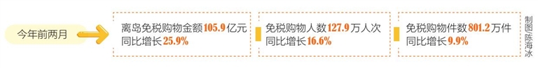 海口海关日前发布统计数据,今年前两月,海关共监管离岛免税购物金额105.9亿元,免税购物人数127.9万人次,免税购物件数801.2万件,同比分别增长25.9%、16.6%、9.9%,“旅游+免税”消费模式再次展现了强劲动力。