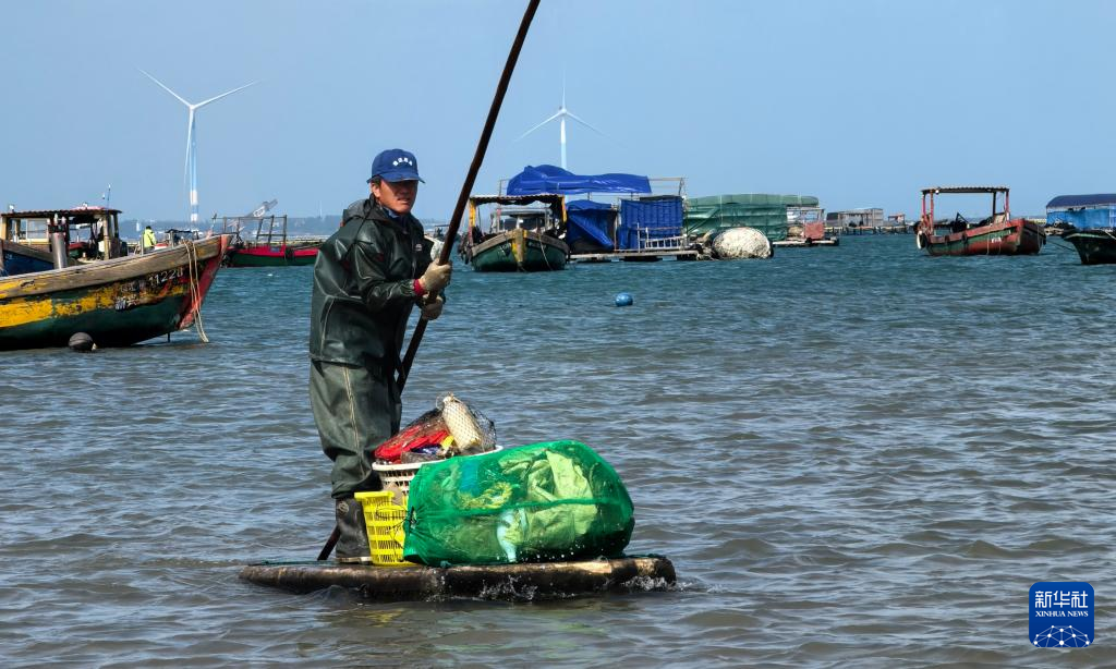 3月13日,澄迈县桥头镇新兴港渔民正向岸边运送海洋垃圾。新华社发(唐清山 摄)