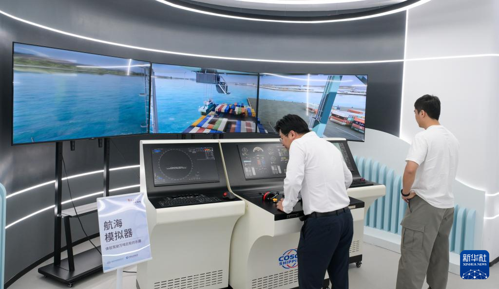 3月19日,观众在“一带一路”主题数字展上进行智慧港口互动体验。新华社记者 杨冠宇 摄