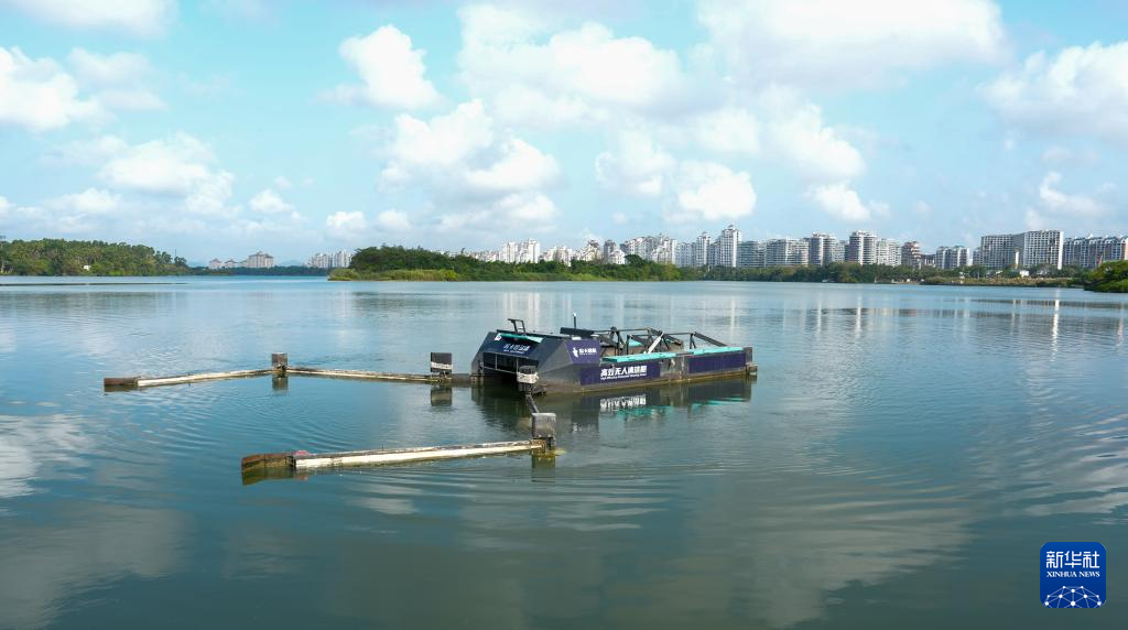水上智慧环卫无人清洁船在万泉河水面作业(3月25日摄)。新华社记者 刘莲芬 摄