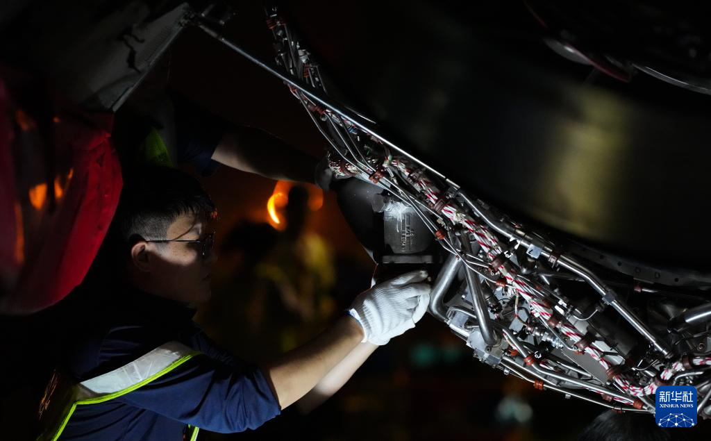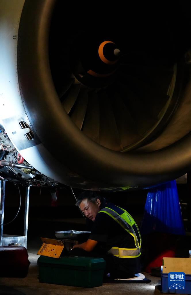 在海口美兰国际机场停机坪上,南航工程技术分公司机务工程师对“消博号”彩绘飞机进行深度检查(4月4日摄)。新华社记者 杨冠宇 摄