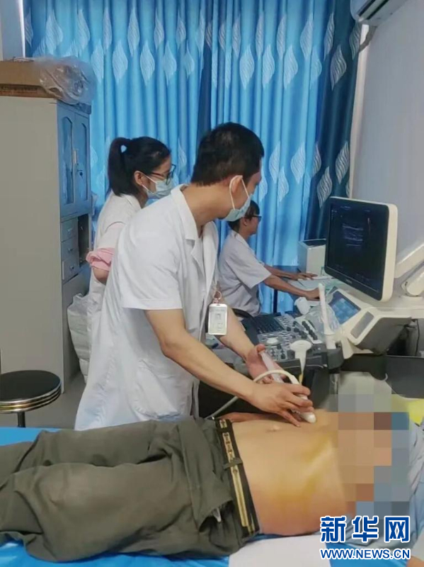 三亚市人民医院医疗集团南田分院医生在为患者进行超声引导下腹横肌筋膜阻滞。新华网发