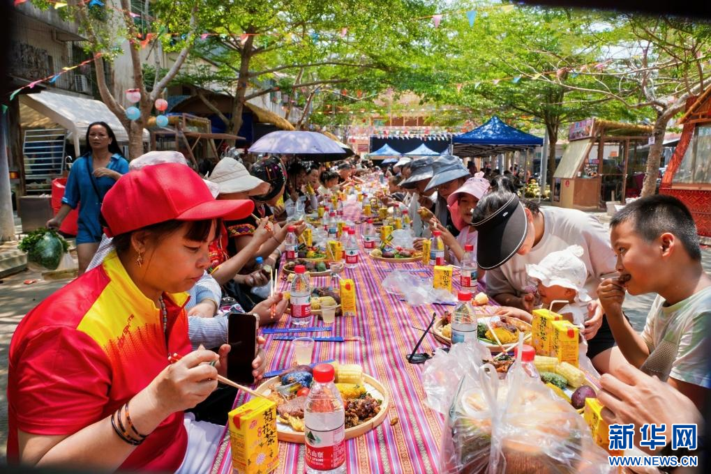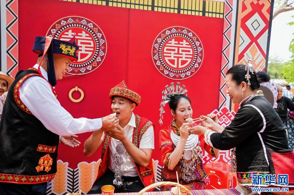 4月11日,在海南省五指山市毛阳镇,以“红色毛阳·黎乡婚恋季——赏梯田·品民俗·去野趣”为主题的欢庆“三月三”活动举行。该活动串联百味市集主会场与牙胡梯田分会场,为群众、游客献上一场沉浸式民俗文化盛宴。
