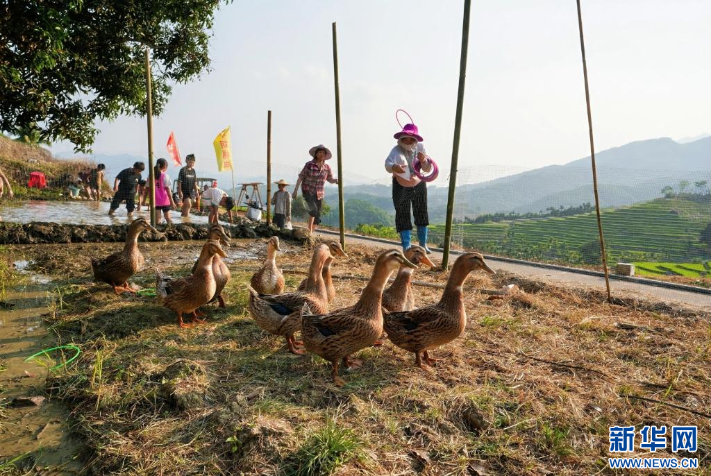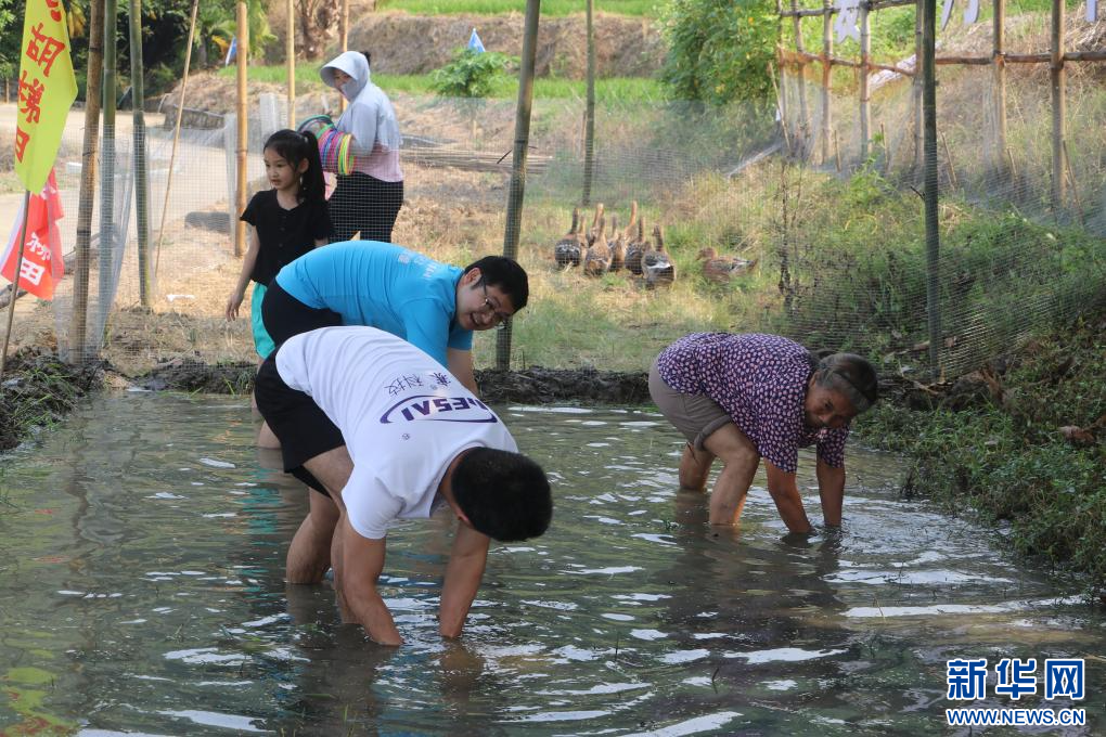 牙胡梯田分会场的稻田抓泥鳅互动活动。新华网发(孟志军 摄)