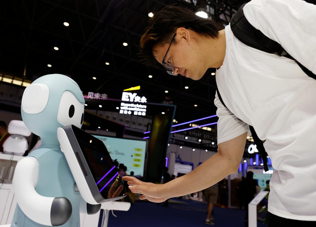 2026年4月14日,参观者在第六届消博会现场观看AI陪伴机器人。新华社记者 郭程 摄