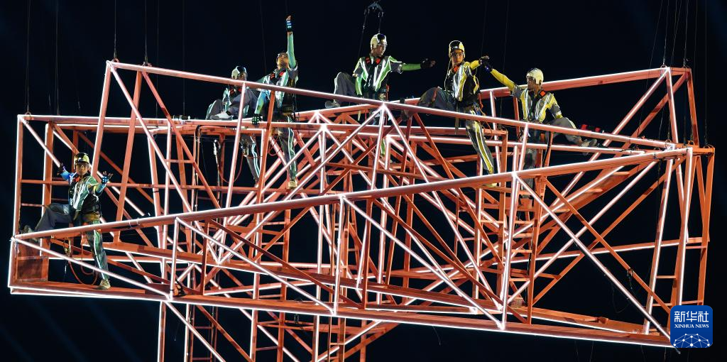 音乐重新变得动感十足,“亚亚”变身自贸港建设者再次登场。8组空中威亚装置通过矩阵组合,变换成大型吊臂、拱形桥梁与深海钻井平台,寓意拔地而起的“梦想巅峰”。逐梦者在巨大的钢架道具上奋力攀登、彼此托举,象征着自贸港建设者攻坚克难的历程。