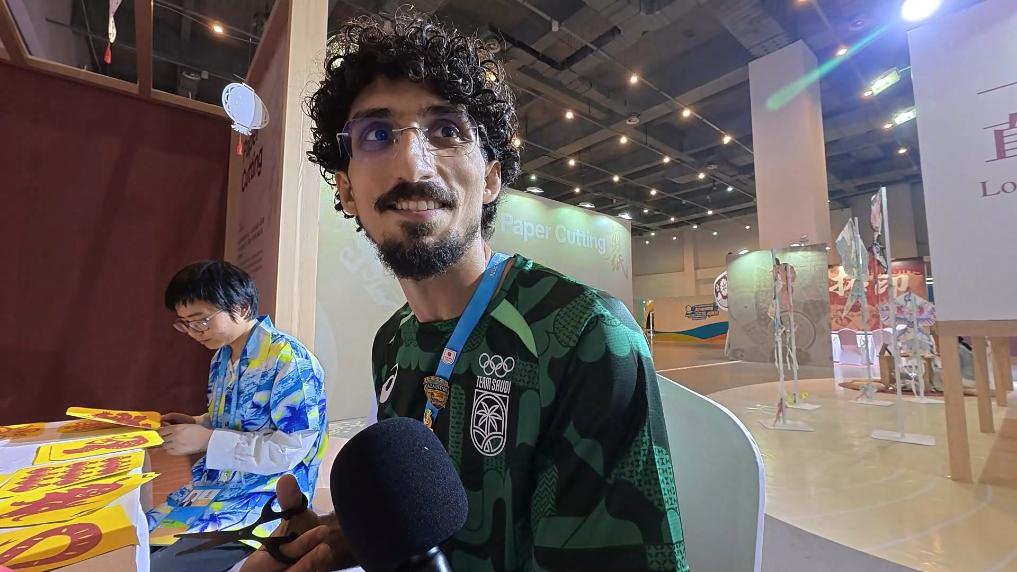 有人第一次拿起剪刀,照着纸样剪出一盏灯笼,说要把这次体验记在心里;有人用毛笔写下阿拉伯文,与中国书法家同写一张宣纸,让两种文字在纸上“相遇”。黎锦传承人坐在织机前,手把手教外国运动员辨认“大力神”图腾,讲述植物染色、手工织造的故事。