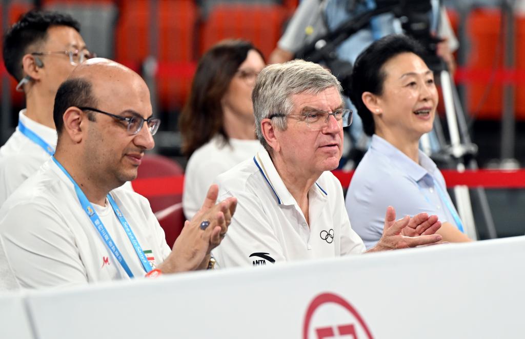 4月25日,国际奥委会终身名誉主席巴赫(中)现场观赛。