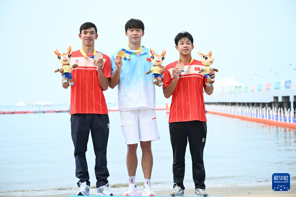 4月26日,冠军中国选手张子扬(中)、亚军越南选手阮辉黄(左)和季军越南选手梅陈俊安在颁奖仪式上。新华社记者 贝赫 摄