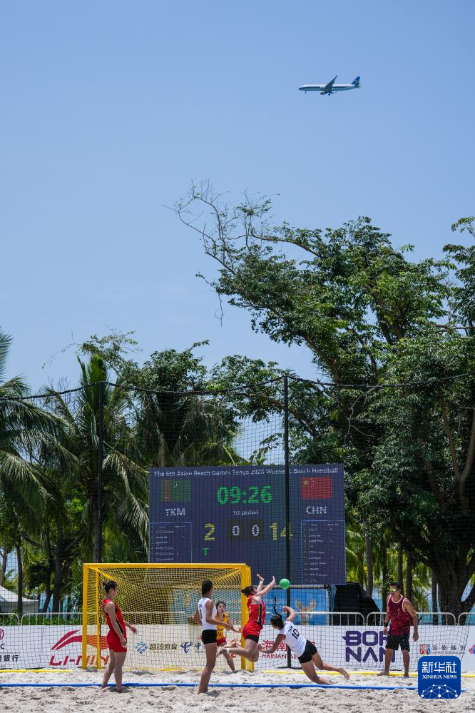 4月26日,在海南三亚举行的第六届亚洲沙滩运动会沙滩手球女子小组赛中,中国队2:0战胜土库曼斯坦队。新华社记者 李博 摄