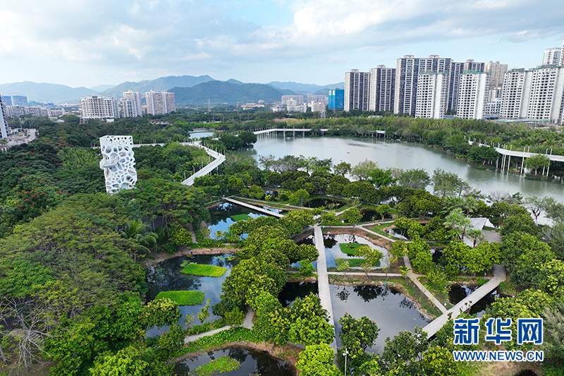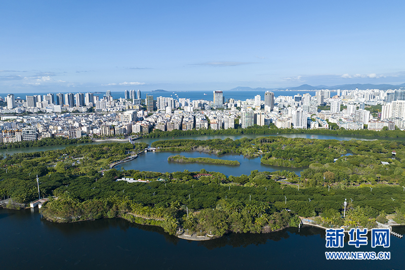 俯瞰三亚白鹭公园及附近水体,水清岸绿,城市与自然交融共生。新华网发