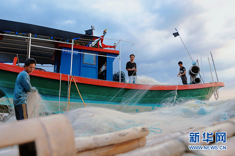 渔民出海归来后整理渔网。新华网发(陈静 摄)